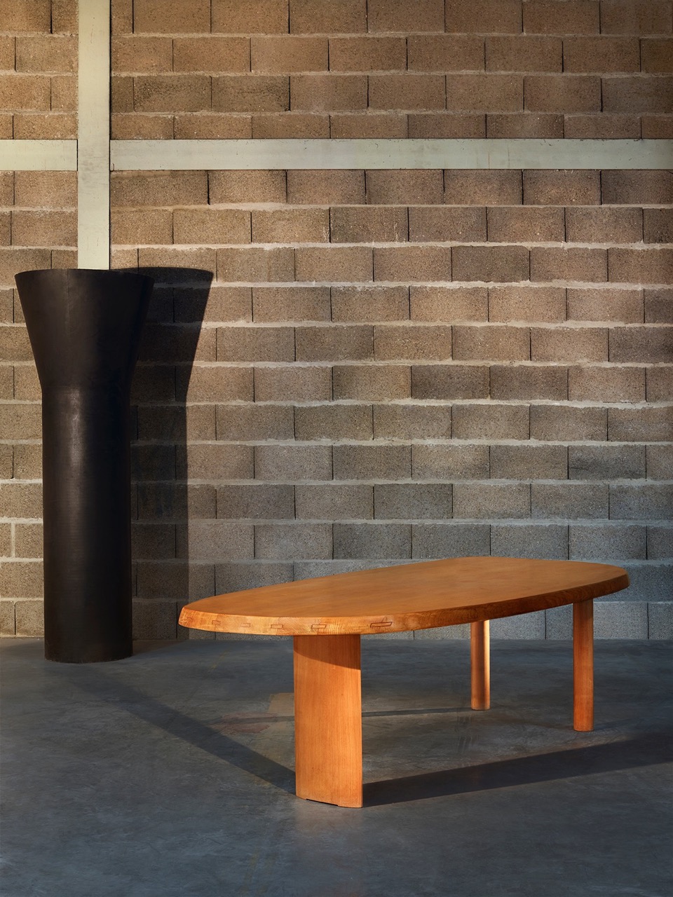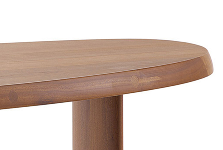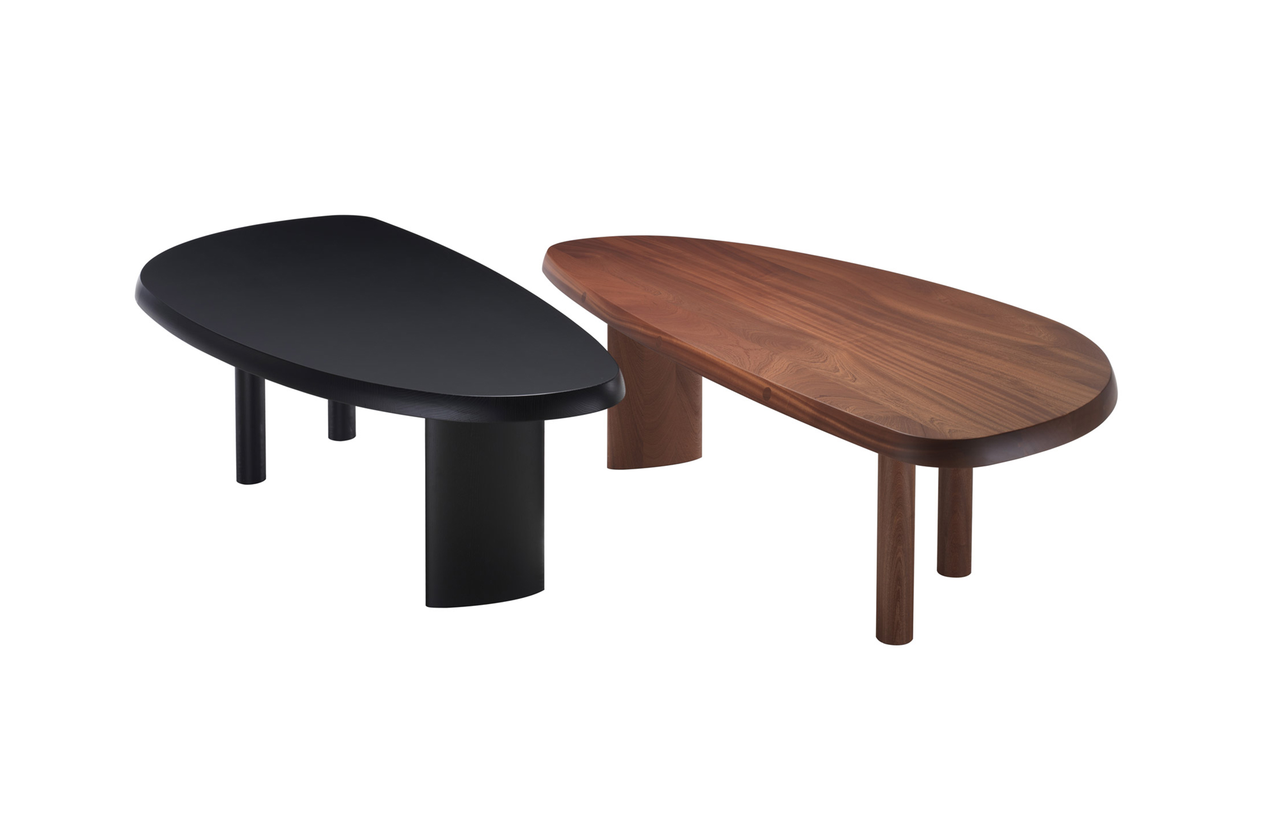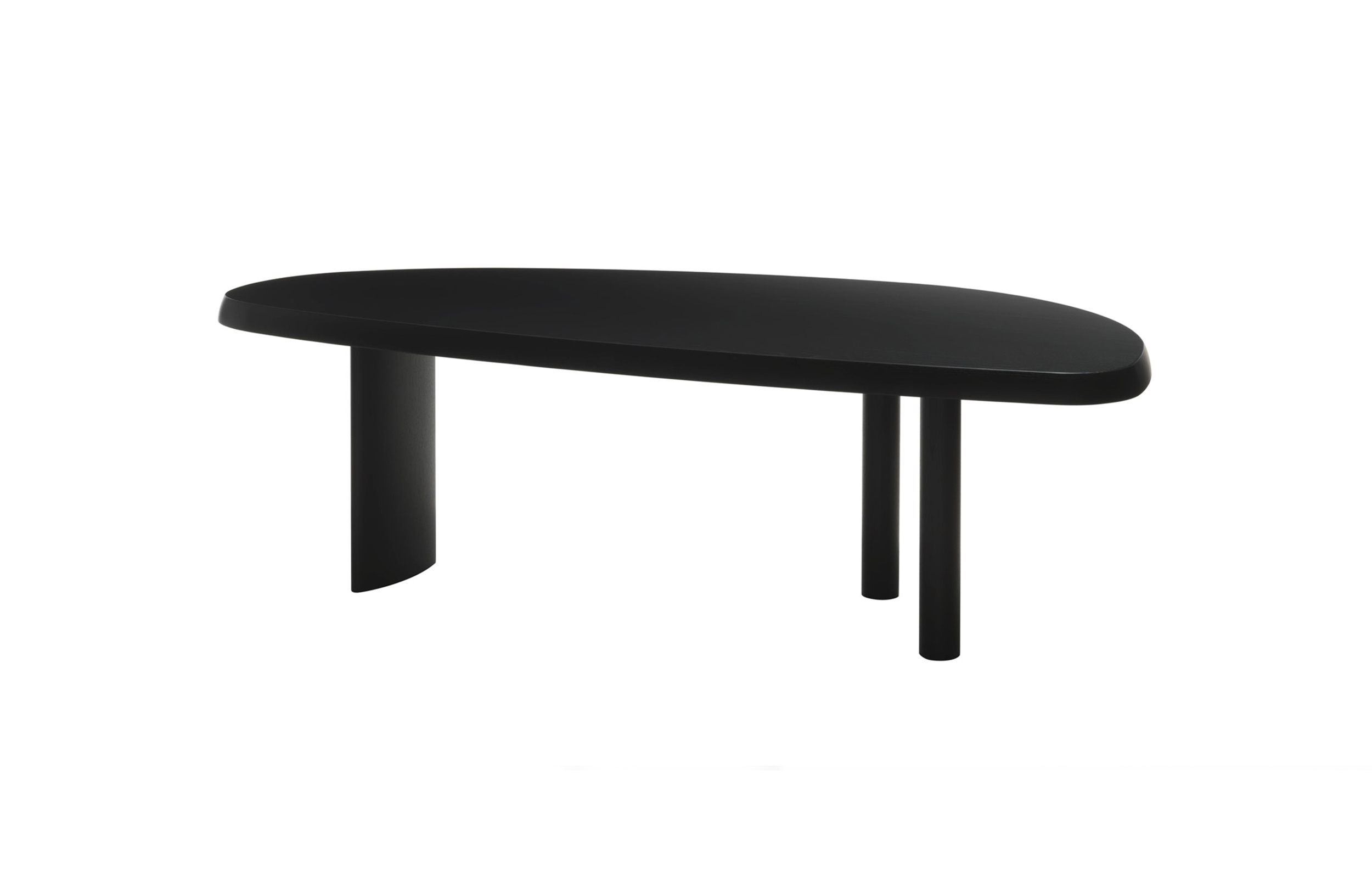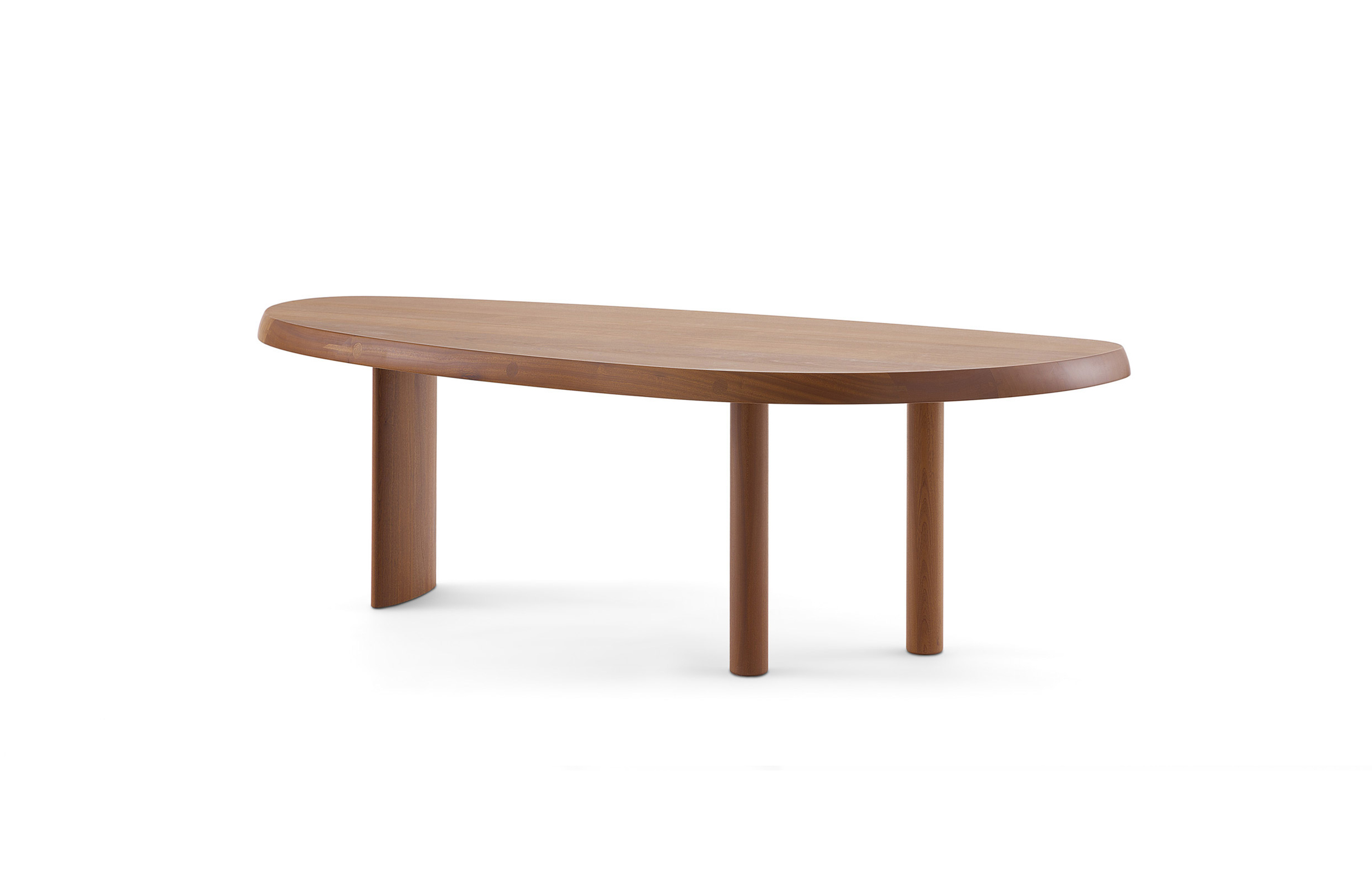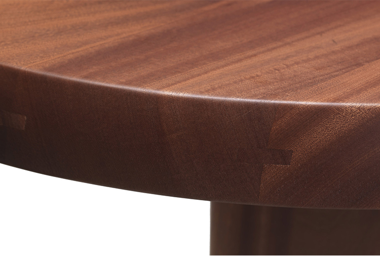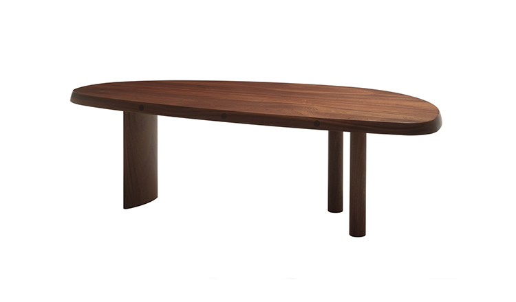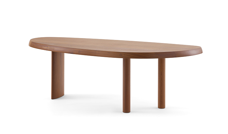 圆面实木面桌。构成桌面的木头拥有明显的侧接点。三条支撑桌腿,一条呈椭圆形的桌腿较大,链条圆柱形的桌腿较小。开孔黑漆橡木或桃花心木饰面。该系列的第一款桌子是于1938年为自己在Montparnasse的工作室设计的,圆形不对称的形状正好适于有限的空间,还突出制作桌子所用木头的天然美丽。因为这款桌子没有棱角,所以可以坐下许多人,是欢乐聚会的好选择。该款桌子采用经受外部因素变化的天然材料,例如:日照、温度、湿度和日常使用。在这款桌子中,不将此类变化视为不利因素,而将其视为材料的独特性,强调天然美丽。