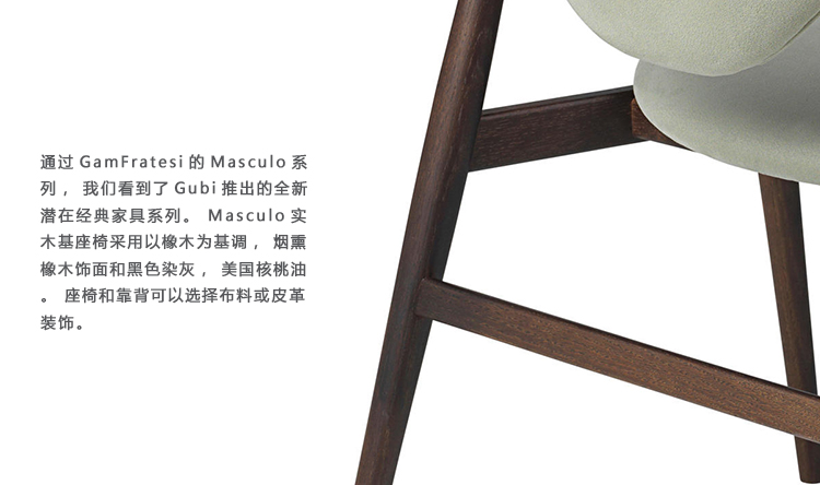 通过GamFratesi的Masculo系列,我们看到了Gubi推出的全新潜在经典家具系列。 Masculo实木基座椅采用以橡木为基调,烟熏橡木饰面和黑色染灰,美国核桃油。 座椅和靠背可以选择布料或皮革装饰。