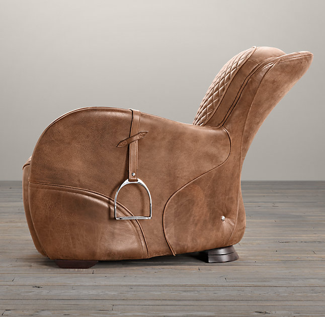 Our chair's equestrian aesthetic is informed by a traditional riding saddle, transformed into a luxurious retreat. Amply padded and swathed in panels of hand-finished leather, it features quilted stitching at the high, angled back and seat, while piping trims the rounded arms.