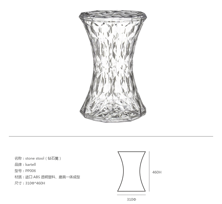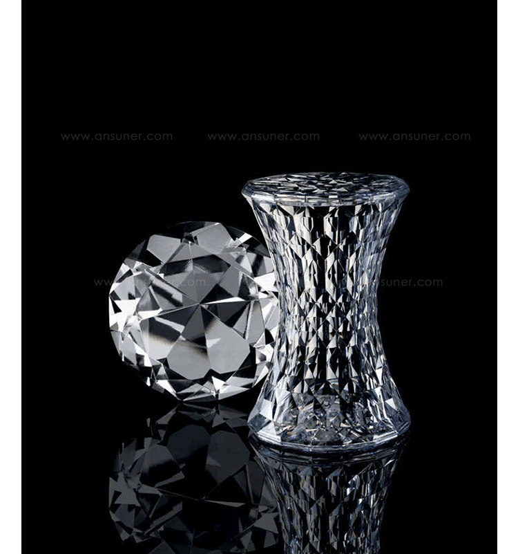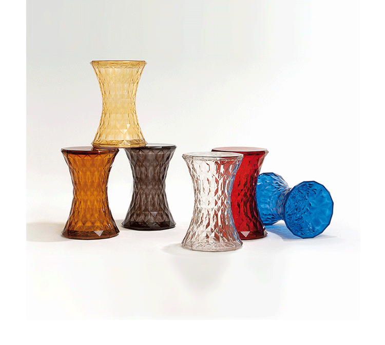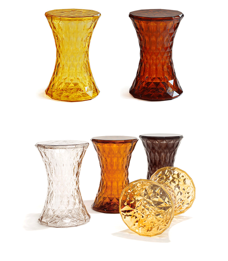 Stone Stool(钻石凳) 是荷兰设计师Marcel Wanders为Kartell公司设计的经典作品。钻石凳沙漏状对称的线形设计,完美的折光和屈光效果;几何小刻面的运用让表面不凡,光线折射后,形成如钻石般璀璨的光芒。舒展拉伸设计的刻面,使产品具有雕塑感。俯瞰产品如万花筒般绚丽多彩,为您呈现出迷幻的别样世界。因其如珠宝般的品质,Stone提供各种珍贵石头的颜色选择。