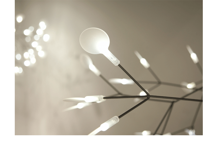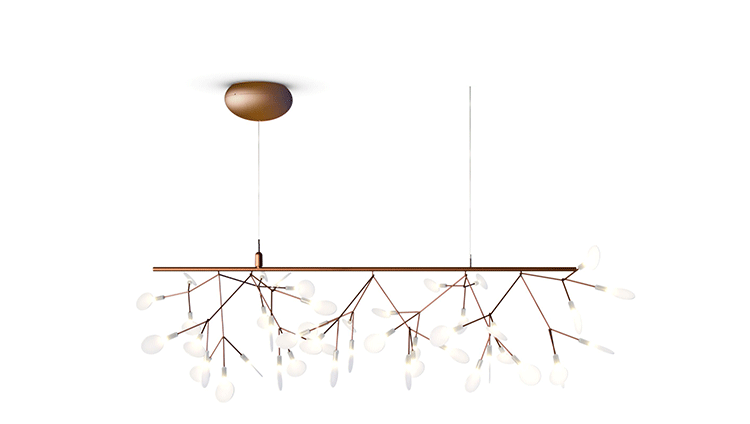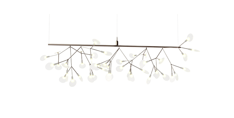 "Decorative LED lamp from Moooi inspired by the Heracleum Plant.The Heracleuom Endless pendant light is a perpetual blossom of new branches that can be added to by the meter. The possibilities are almost limitless by combining straight lines, angles and corners.'Leaves' splay out from 'stems' creating a very technical but natural structure. This pendant light design is created by using the technique of coating conductive layers which would not be possible with normal wires.The Heracleum 'leaves' are not frozen in one position. They can be freely re-positioned by rotating them around their stem. Heracleum includes a new LED which is much more efficient while providing unique and sparkling illumination.Metal wire frame available in a copper or nickel finish (see images) , polycarbonate lenses, steel canopy. Complete with 4m translucent cables.Dimmable with mains voltage dimmer (dimmer for incandescent, halogen). Please make sure to use a dimmer rated for a low power luminaire.Heracleum now includes a new LED that allows endless technical possibilities, making this new version much more efficient while providing unique and sparkling illumination.Available as 116cm sections with 2 types of connector, either 90 or 135 degrees or with end cover set. 2 suspension wires for each section. Canopy - 1 per section in matching finish, copper or nickel."