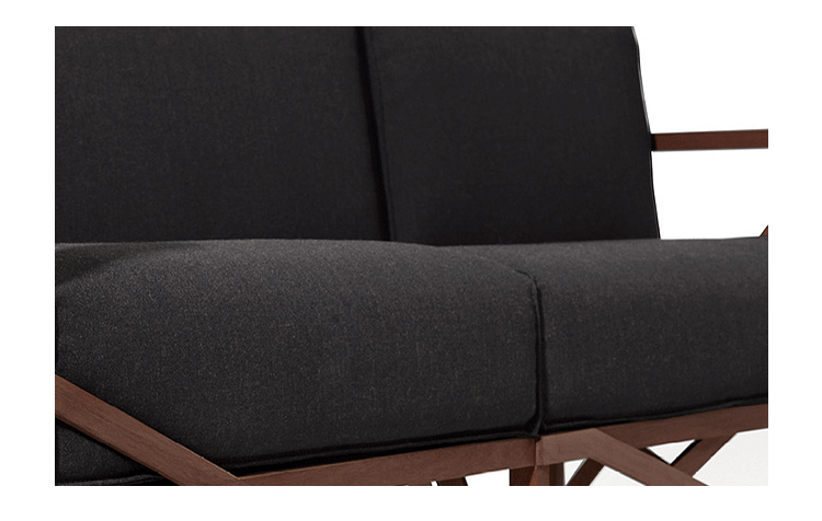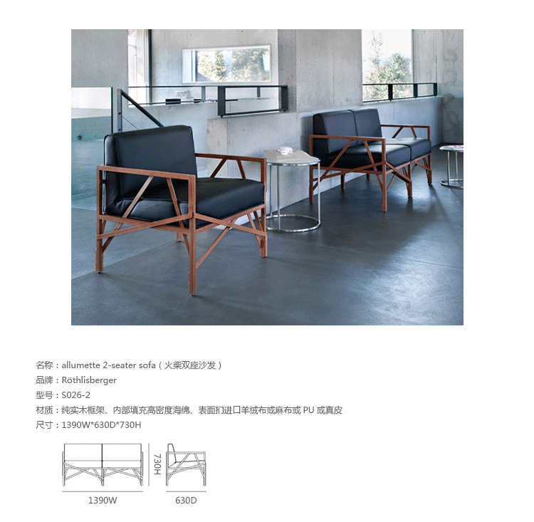 瑞士设计师Atelier Oï为Röthlisberger设计的一款沙发系列名为“Allumette(火柴)”,有单座、双座和三座。ALLUMETTE 沙发的醒目外观是归因于其来自阿鲁拉豆木树的硬木雕刻镂空框架设计。在这里,压力和反压力接受负荷的相互作用。优雅和独创性与稳定性相结合。其金属般基调的非漆木材经过打磨、抛光处理,允许其感性的存在,以充分发展。坐垫及靠垫内部填充高密度海绵、表面扪进口羊绒布或麻布或PU或真皮,提供高度的舒适感。