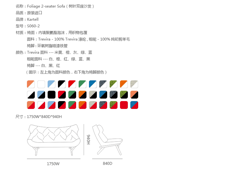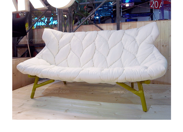 在西班牙鬼才设计师Patricia Urquiola的工作与美学中,大自然与人造是不变的主题,树叶沙发系列很好的表现了她的价值观,柔软的座椅,树叶造型,体现着生态与环保,尤其适合家庭使用。这套家具有单座或者双座,造型非常自然生态︰ 图漆金属框架,舒适的座位,树叶造型缝线,时刻让人联想到一棵枝繁叶茂树。椅面才有舒适的布料或者纤维织物和羊毛混纺,椅脚为环氧树脂喷漆铁管。通过活泼的色彩革新的材料,精湛的缝纫工艺完成了一把具有很高潜在表现力的椅子。