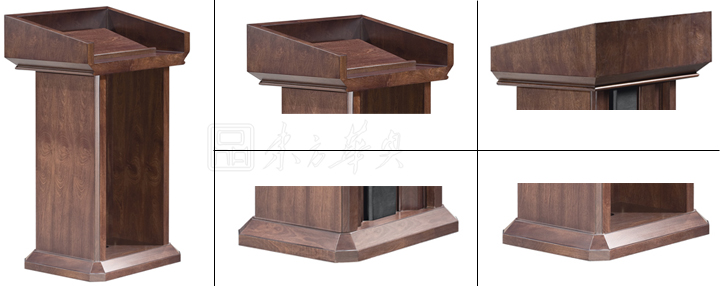 ※    上图为演讲台细节展示图,可选配话筒等配件,优美的弧形主体,木质油漆结构,进口油漆,国内首创内增加纳米银抗菌材料。