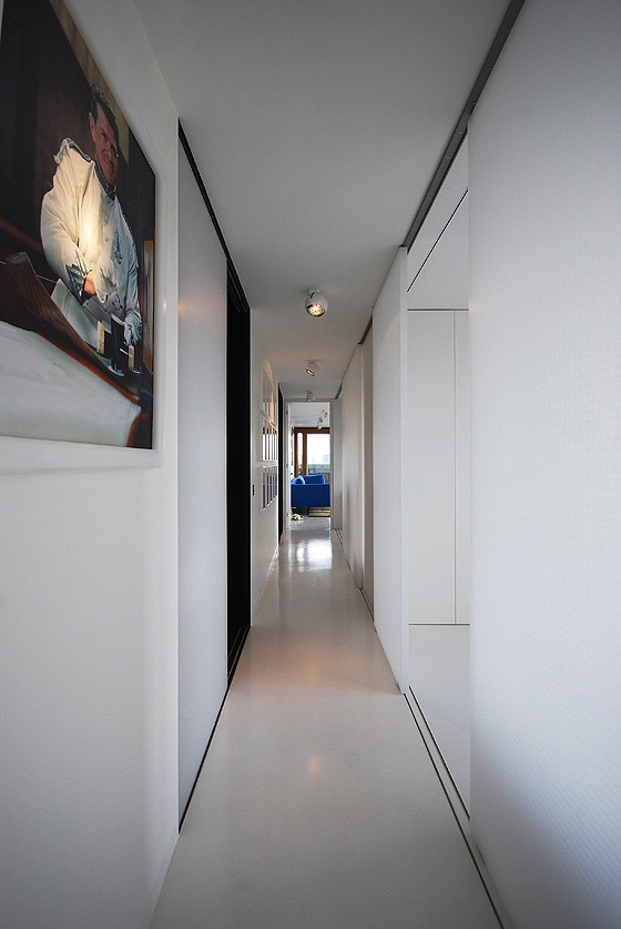 REFURBISHMENT OF A LISTED TOWER APARTMENT The flat is located above the city of London, only a short walk from the financial district amidst a on first sight, rough concrete oasis - the listed Barbican Centre. There is no traffic, instead ponds, gardens and a distinguished cultural centre on the ground level, including a concert hall, theatres, art galleries and cinemas. The 100 m² flat on the 17th floor of the Shakespeare Tower with spectacular view over the roofs of the city shall be the new residence of our client and also serve as an exhibition space. When the client purchased the flat it looked as if it was frozen in time with yellowed carpeting and the original kitchenette, albeit seemingly run down. Nevertheless the flat had a well arranged floor plan, although the corridor, kitchen and bathroom were located towards the inside of the building and therefore appeared dark and small. A Loggia stretches all around the flat. On the east side in front of the kitchen window it forms a terrace which offers unobstructed views over the skyline. From breakfast with the sunrise to an evening sunset it is only a few steps along the balcony. The flat shall become more flexible and spacious while maintaining the historic floor plan. Space for the display of contemporary art shall also be offered. The panoramic view must be visible from all corners of the flat. In order to achieve a greater lightness, the wall between the corridor and bedrooms was replaced by translucent sliding panels. Living rooms are completely coloured in white to underline their spaciousness and to form a minimalistic background for the art collection. In harsh contrast to this, the walls of the internal spaces of the corridor, bathroom and kitchen are coated with a smooth shimmering black cement finish. The dark finish allows small rooms to work larger and adds an elegance with the contrast to the white fixtures. The structure of the flat with its three layers becomes visible: the outside loggia, the white living rooms and the bathroom and kitchen completely wrapped in black. The solid wall between the bathroom and corridor was also removed and replaced by translucent sliding doors. When open, the owner can enjoy the panoramic view while soaking in the bathtub. If the balcony doors are also open, the gentle rumble of the metropolis can also be heard. The Barbican Estate was built between 1965 and 1976, on a site that was bombed in World War II.The complex was designed by the architects Chamberlin, Powell and Bon. The estate was officially opened in 1969 and is now home to around 4,000 people living in 2,014 flats. The flats reflect the widespread use in Britain in the 1960s and 1970s of concrete as the visible face of the building. "The intention underlying our design is to create a coherent residential precinct in which people can live both conveniently and with pleasure. Despite its high density the layout is spacious: the buildings and the space between them are composed in such a way as to create a clear sense of order without monotony. Uninterrupted by road traffic (which is kept separate from pedestrian circulation through and about the neighbourhood) a quiet precinct will be created in which people will be able to move about freely enjoying constantly changing perspectives or terraces, lawns, trees and flowers seen against the background or the new buildings or reflected in the ornamental lake." Chamberlin, Powell & Bon, Architects "Barbican Redevelopment" April 1959