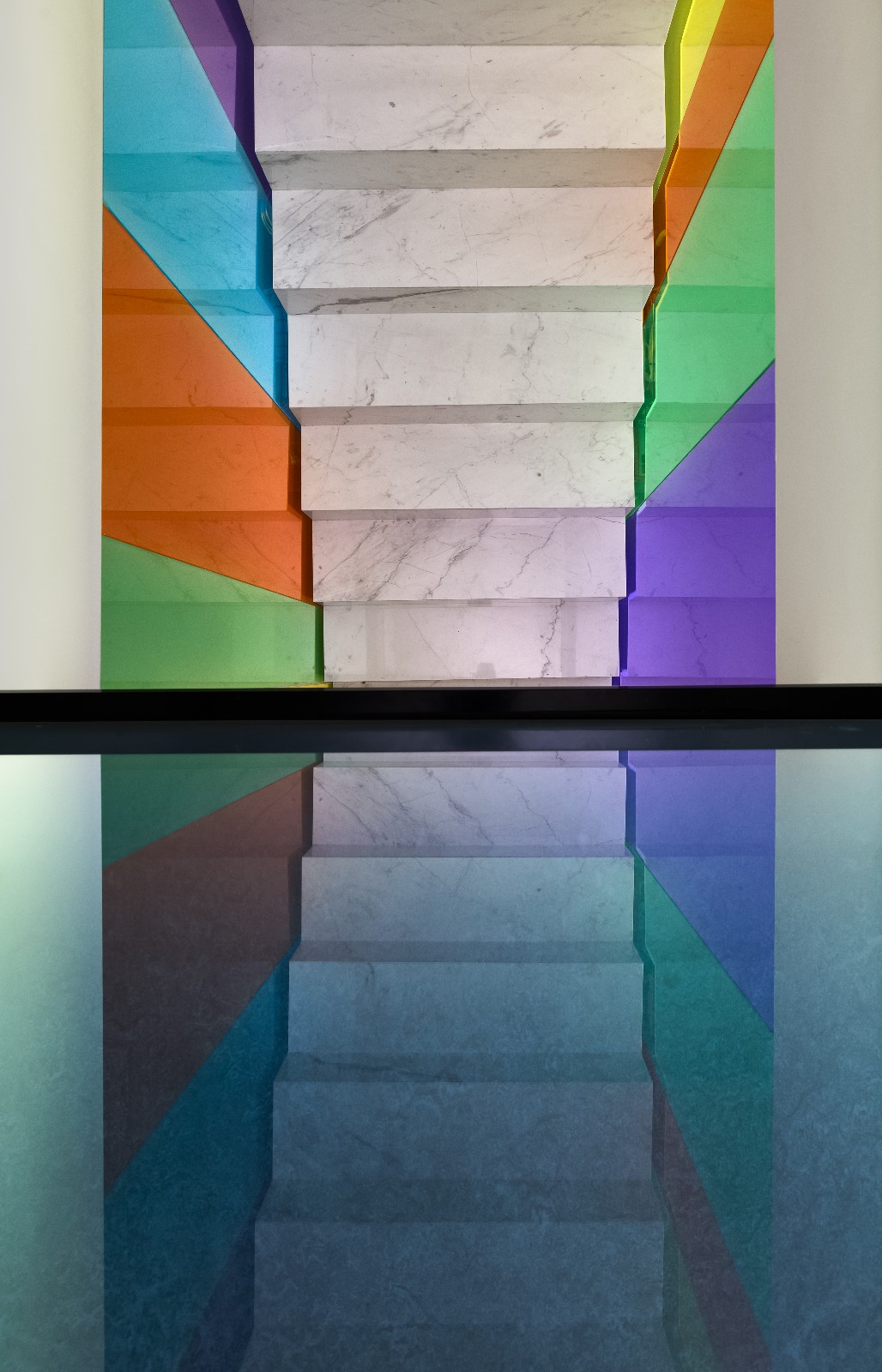 继续前进,你会发现一道纯白色大理石架空楼梯嵌于两道“彩虹”之间,一字排开的的楼梯和顶天立地的玻璃形成天然屏风,前台区和员工区自然分割互不干扰。行走上面,似有如梦似幻的感觉,这彩色一直延伸至二楼,并围绕楼梯洞口完成交圈。