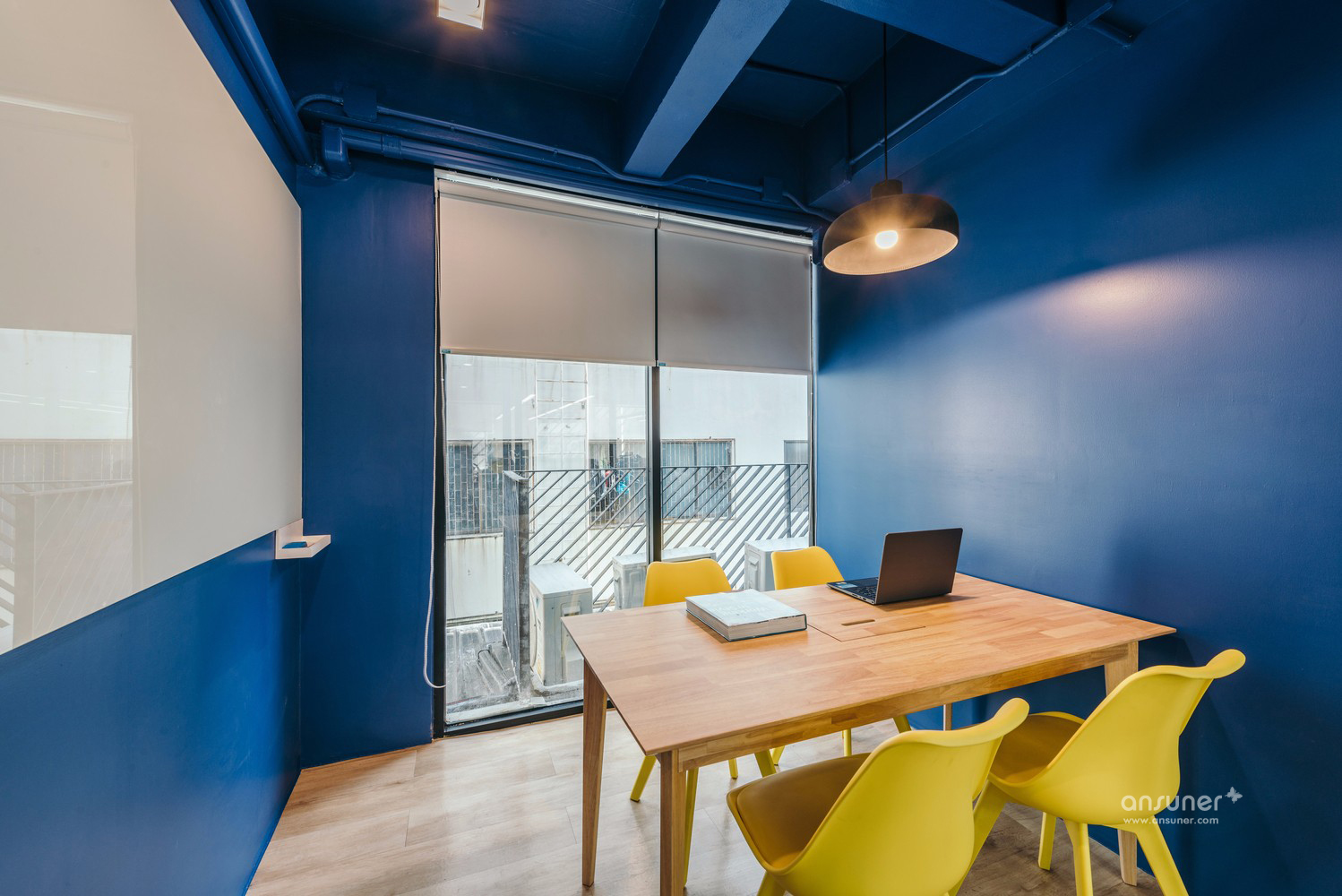 另一个有趣的方面就是该建筑的立面由百叶窗组成。这个铝制的百叶窗立面以对角线的方向设立来展现这个公司的特点并非简单的直线如此普通的设计。这种延续的对角线试的百叶窗提供了一种生气勃勃且流畅的感觉。因此在楼层之间也没有阻挡的框架。