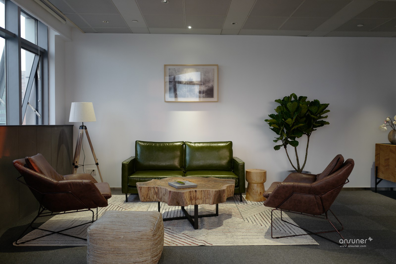 为了营造轻松的工作环境,除了休闲区的配置,设计师还专门到距离上海两百多公里的浙江农村,收罗老树根、老木料,加上定制的黑钢脚,制作成别具一格的茶几、长凳等家具。
