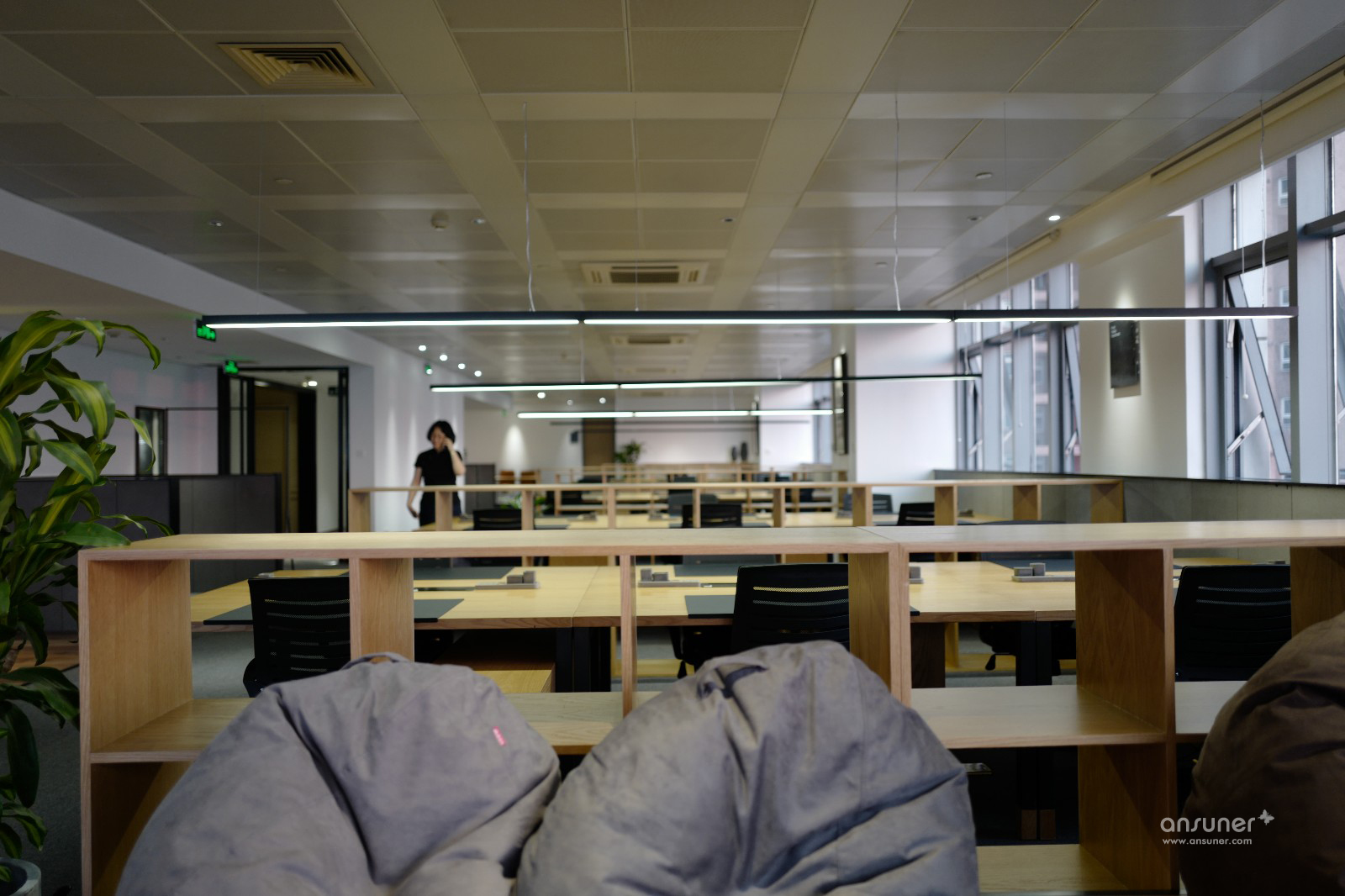 设计师以不同的地台、物料来划分功能区域,用灰色阻燃地毯铺设办公区地面、暖灰色木地板和高台分割出工间休闲区。