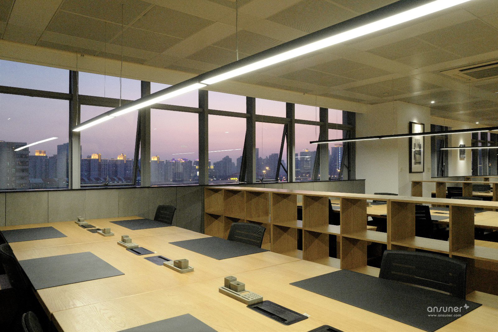 在照明设计上,设计师拆除了原空间灯管裸露的5600k高色温日光灯,在工作台上方重新布置了暗藏灯源的4000k色温长条吊灯,其它区域布置了高防眩筒灯,将原先令人精神高度紧张的冷白光照明改成区分重点、既能集中精神又不易造成视疲劳的点状中性光照明,让眼睛处于最舒适的状态。