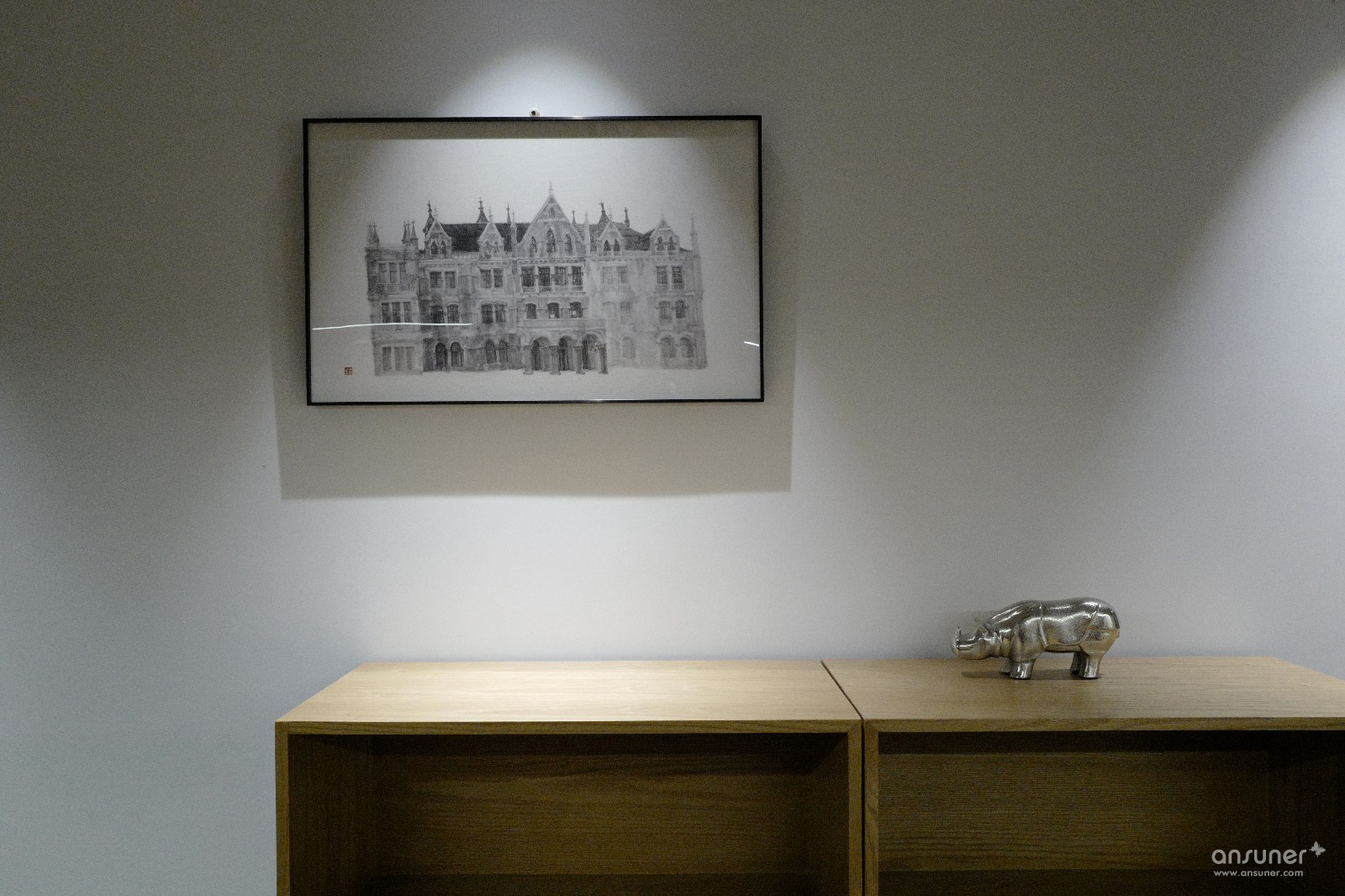 由于物业不允许拆改原建筑不锈钢护栏,设计师用水泥板做了包裹,遮盖住落地窗下半部无序的线条和采光,不仅使整体感更强,而且将窗外自然光集中在工作台上方照入,更利于设计师集中精神。