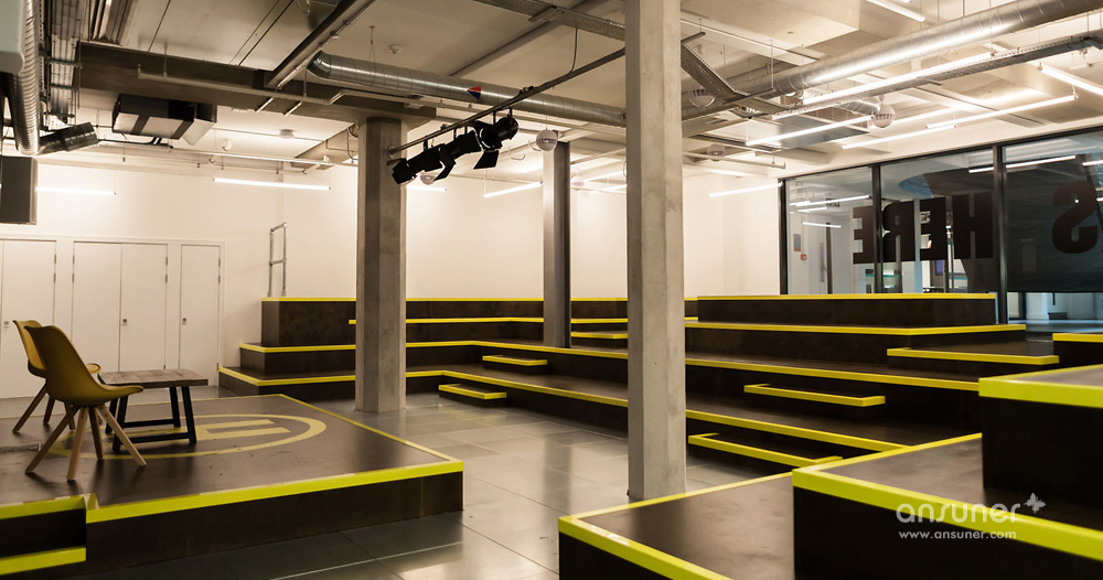 ▼300人座的大礼堂,以染色夹板制作的阶梯式座位并配以专业的舞台灯光,可以直接从Huckletree和Alphabeta中庭进入,这里经常会为其会员和公众举办相关活动;