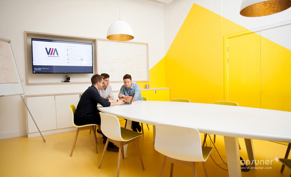 ▼合作交流区,以柔软的沙发和间接光照营造一个私密的社交场合;
