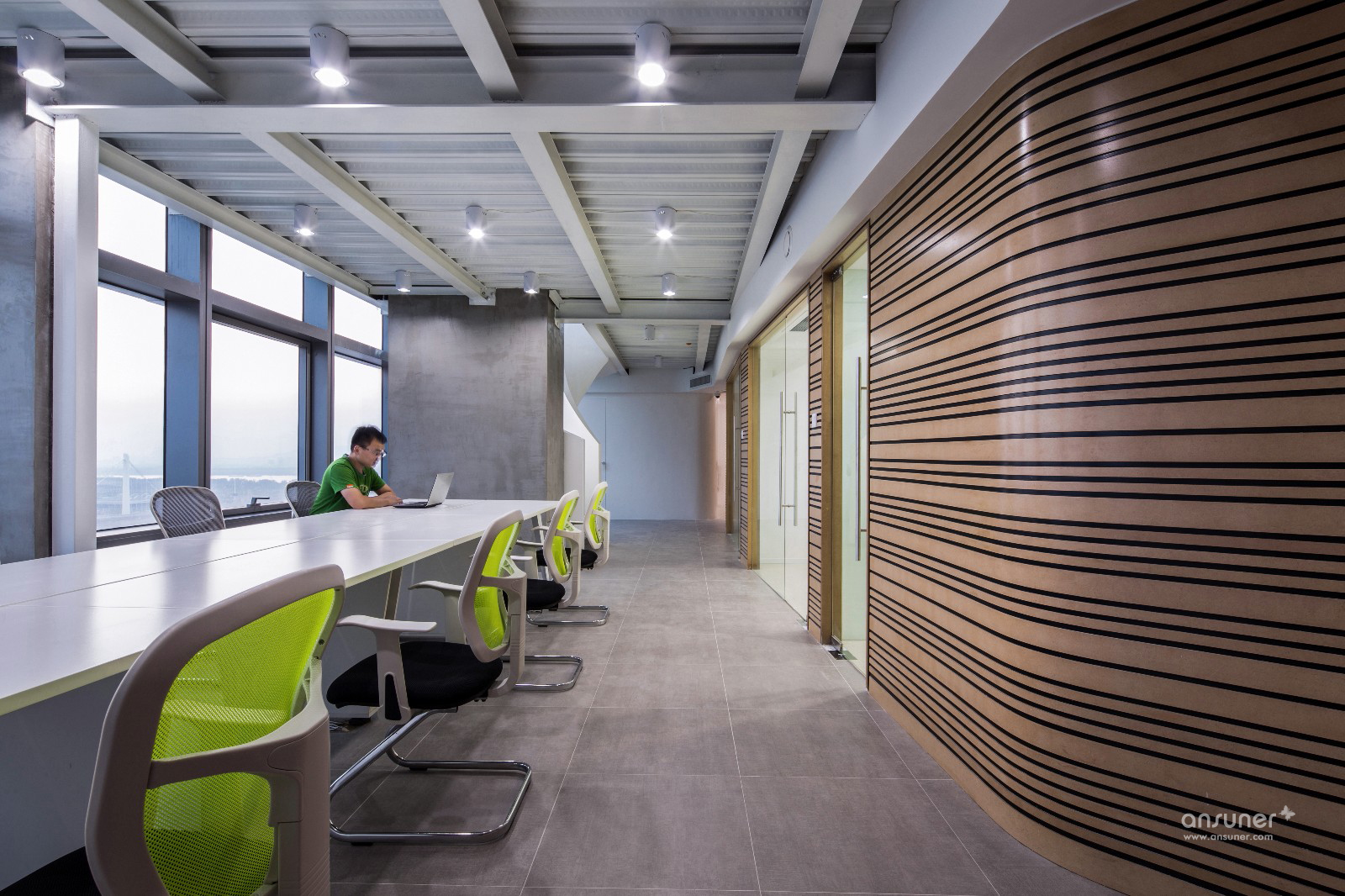 甲方最终敲定南京苏宁慧谷中心。新的办公室由5套50-70㎡不等的loft户型组合而成,一乘二的形式可以轻松获得双倍的办公面积。这也是Loft户型优点的最大体现,叠加赋予空间更强的可塑性,同时也带来层高相对局促的弊病,本案亦是如此。作为一家集产品研发、集成、销售、服务于一体的科技通信公司,业主提出了众多非常规的功能要求,如设立仓库、维修室、实验室、工具间等。这些相对独立的空间需要在布局中优化考虑,以确保实验、办公、出货的高效进行,同时还要克服空间的开阔性不够带来的采光不足等问题。如何将5套loft打通的狭长空间规划得有声有色,既满足功能需求又贴切公司的企业形象?这是设计师面临的主要问题。在此我们大胆运用了弧形线条作为主要设计元素,这样可以更加有效的对空间进行自由分割,同时打破办公室横平竖直、千篇一律的常态。从空间的布置分割到墙面的密集装饰线条,乃至楼梯的造型。曲形线、面无处不在。自由延伸的线条令人不禁遐想到无限蔓延的电波,更给人动态流畅的视觉感受。