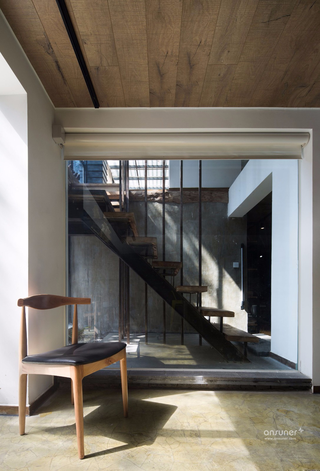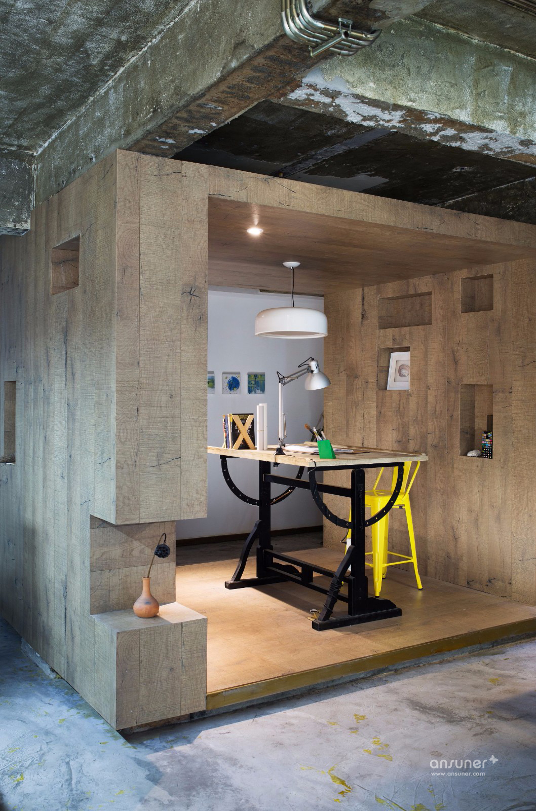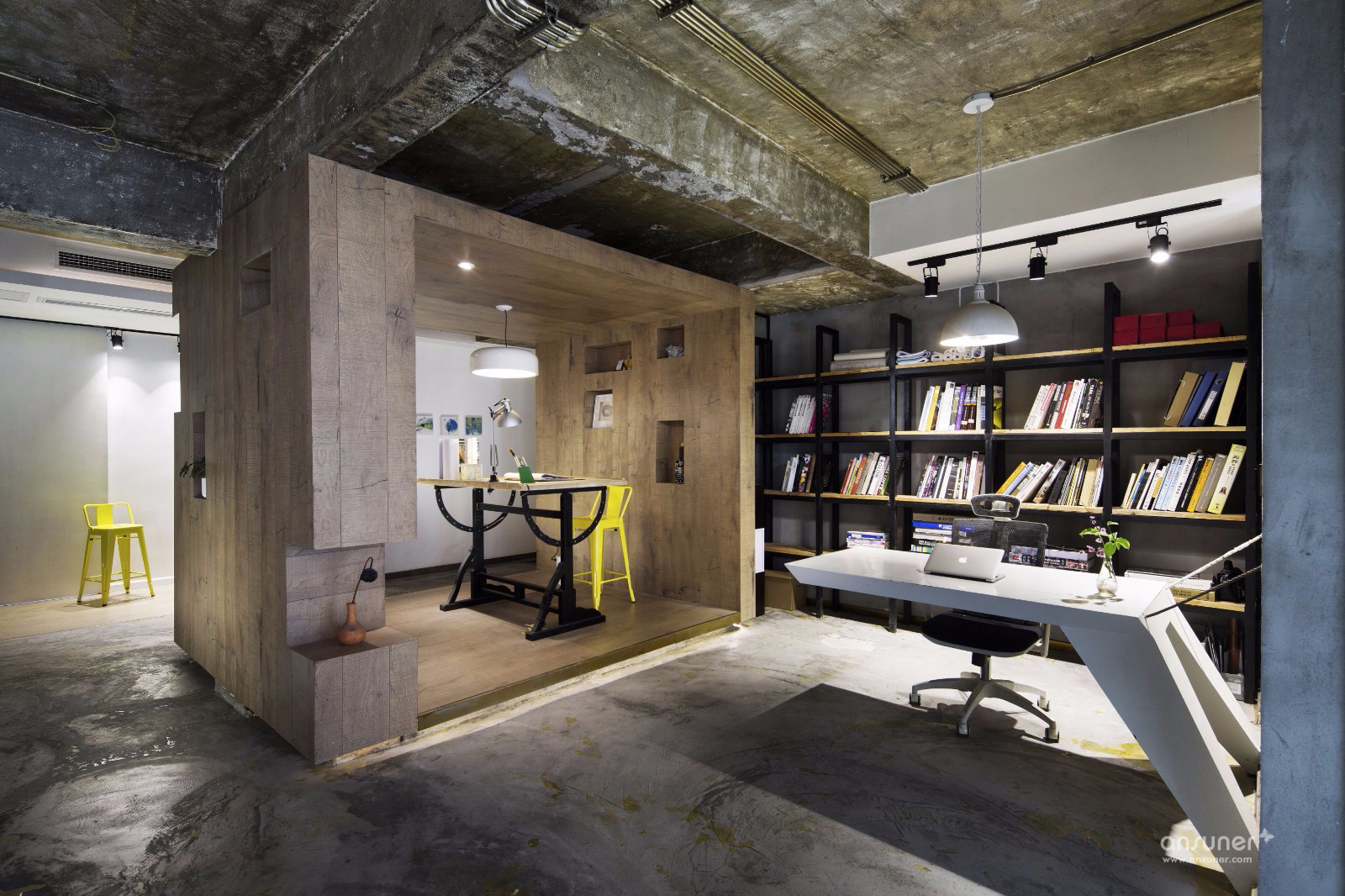 办公空间一共分为上下两层,上层是日常的办公空间,所有墙面的色泽深浅变化与印压痕迹,打造出新旧交融的后现代风格空间,独具粗犷的美感,。办公桌椅及办公用具皆采用白色,与空间色调搭配既和谐又现代。场地对角线处隔出一个玻璃空间和木框空间,采用半隔断的方式使空间的划分自由度很高,平常可用于简单的会议和会客,通透的玻璃天花板让采光变的更通透,再配以随时开合的玄色卷帘,显得极为体贴温馨。