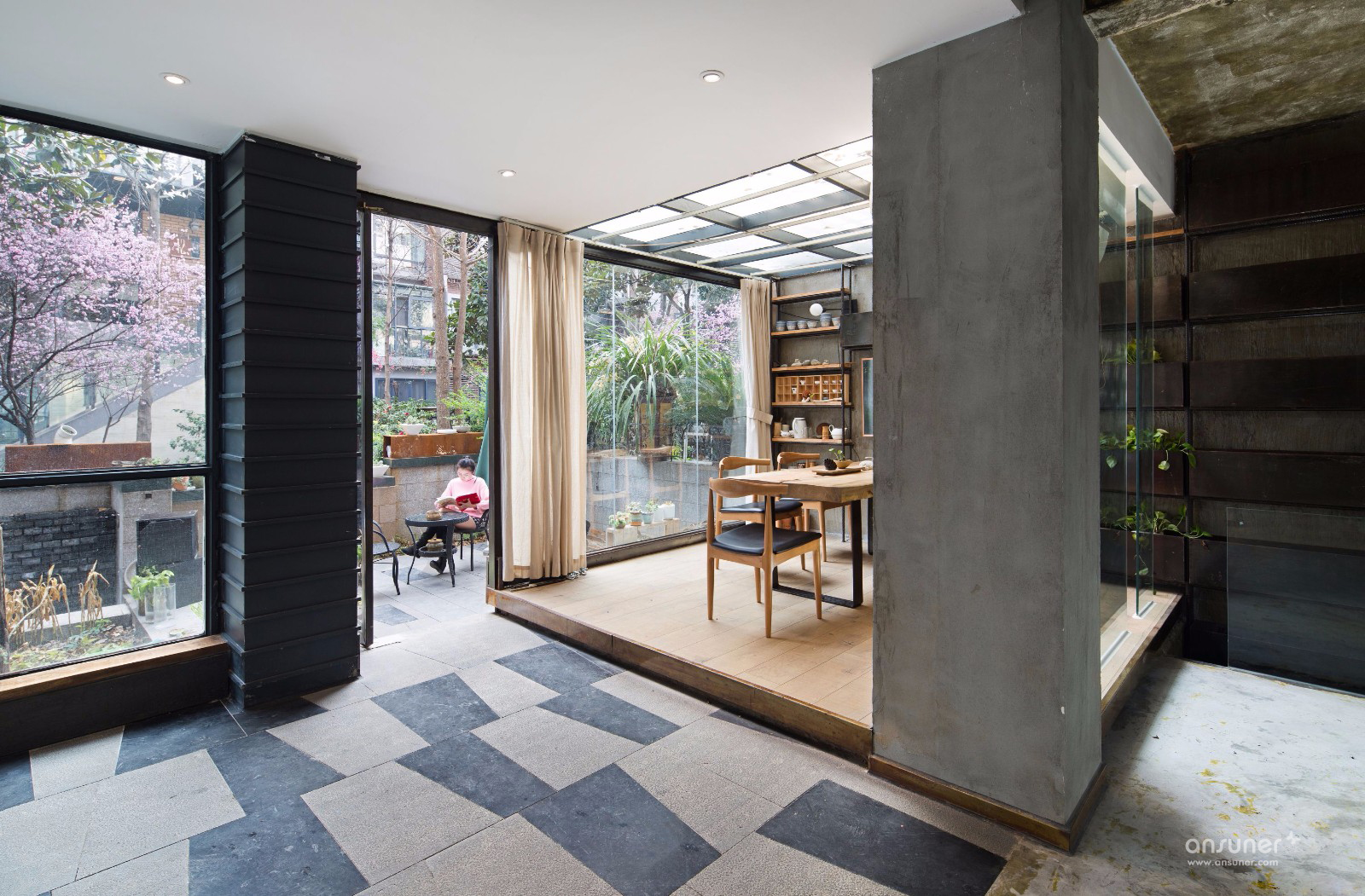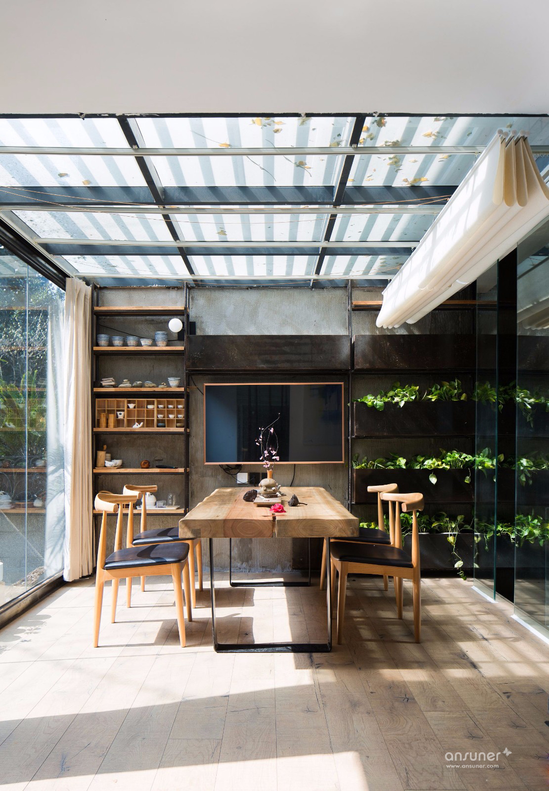 庭院里堆满的绿植,郁郁葱葱的树木,阳光和凉风,茶水和谈笑风生,有一瞬间你会迷失恍惚,不知身处办公室还是远野的屋落。这便是 TCD空间的理念:将空间做到极简,却将自然、人情与生活做到极致。我想这就是生活的美学也是设计的哲学。
