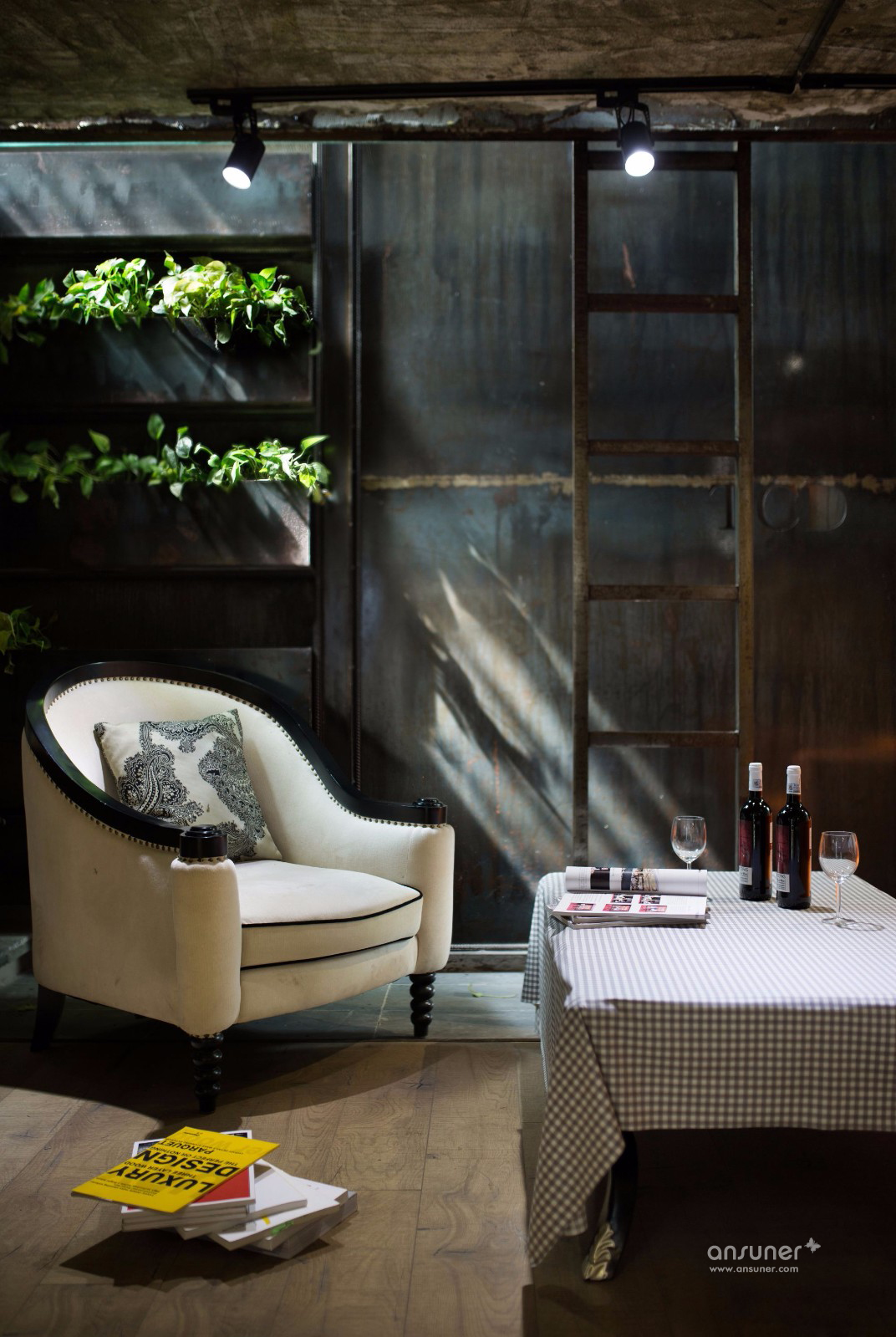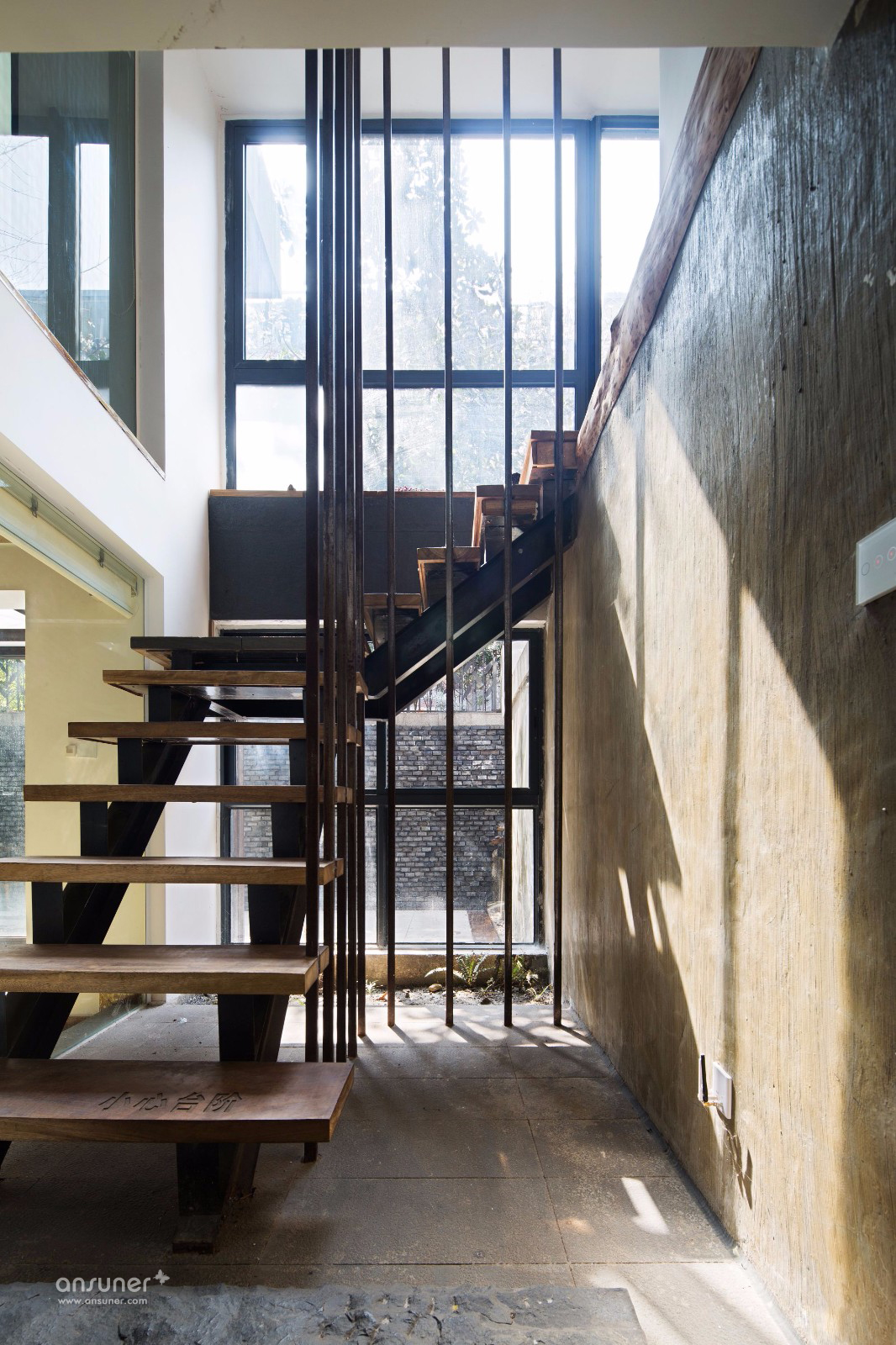 下层是半封闭的庭院空间,从上下互通的围栏到楼梯,皆用裸露的钢结构组成,所有的铁块、钢管都是事先经过太阳暴晒形成锈迹,再加以应用。楼层间是一整面墙,铁质槽口处,种了些许植物,中间的空白处,镂刻出“TCD”三个字母。看似简单干净的旧式厂房里,却涌动着一股清新的气息。下层的空间可以说就是一个家的样子,几张长沙发随意摆放,惬意的茶水区,可供娱乐和休息。困顿倦怠的时候随时可从1楼办公区移步到下层小憩养神。