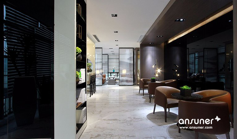 主要材料:石材、地毯、黑色不镜钢、壁布、皮革、烤漆板、木地板、木饰面
