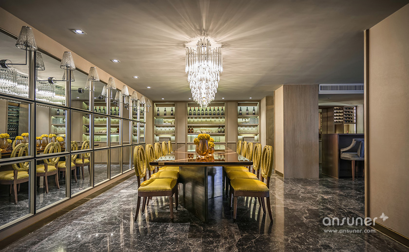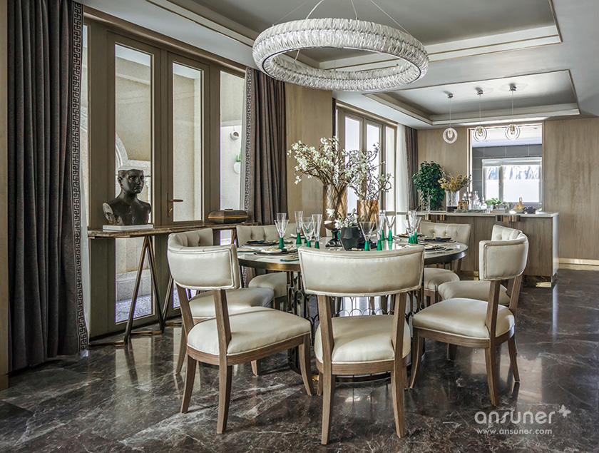 在聚餐厅,你可见独具风情的铆钉元素餐椅,来自欧洲的复古家具,宛若白流苏一般的水晶吊灯,图案独特的地毯与精美的花艺,交叠出艺术的格调。