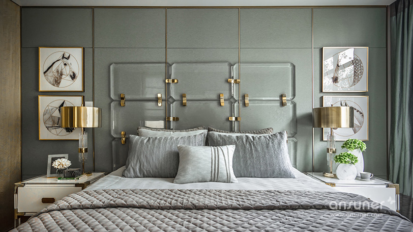 主卧休息室主调为灰色,整体空间庄重内敛,铜质饰品的介入,形成一脉形成的艺术感。